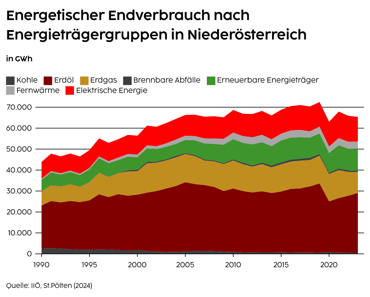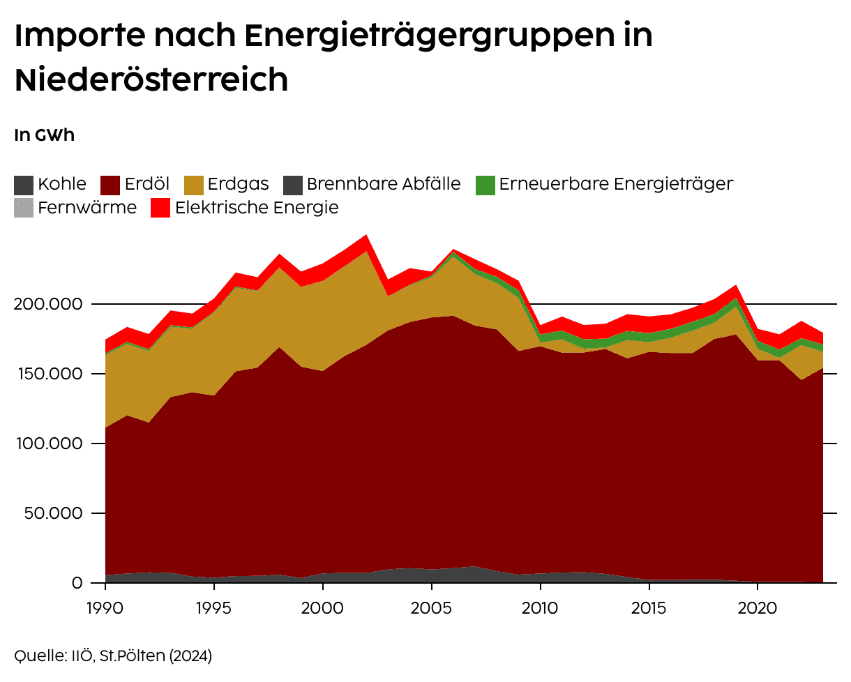 Zur Deckung des Energiebedarfs bzw. zur Weiterverarbeitung importieren Österreich und Niederösterreich Energieträger wie Kohle, Erdöl, Erdgas, Erneuerbare Energieträger und elektrische Energie.
