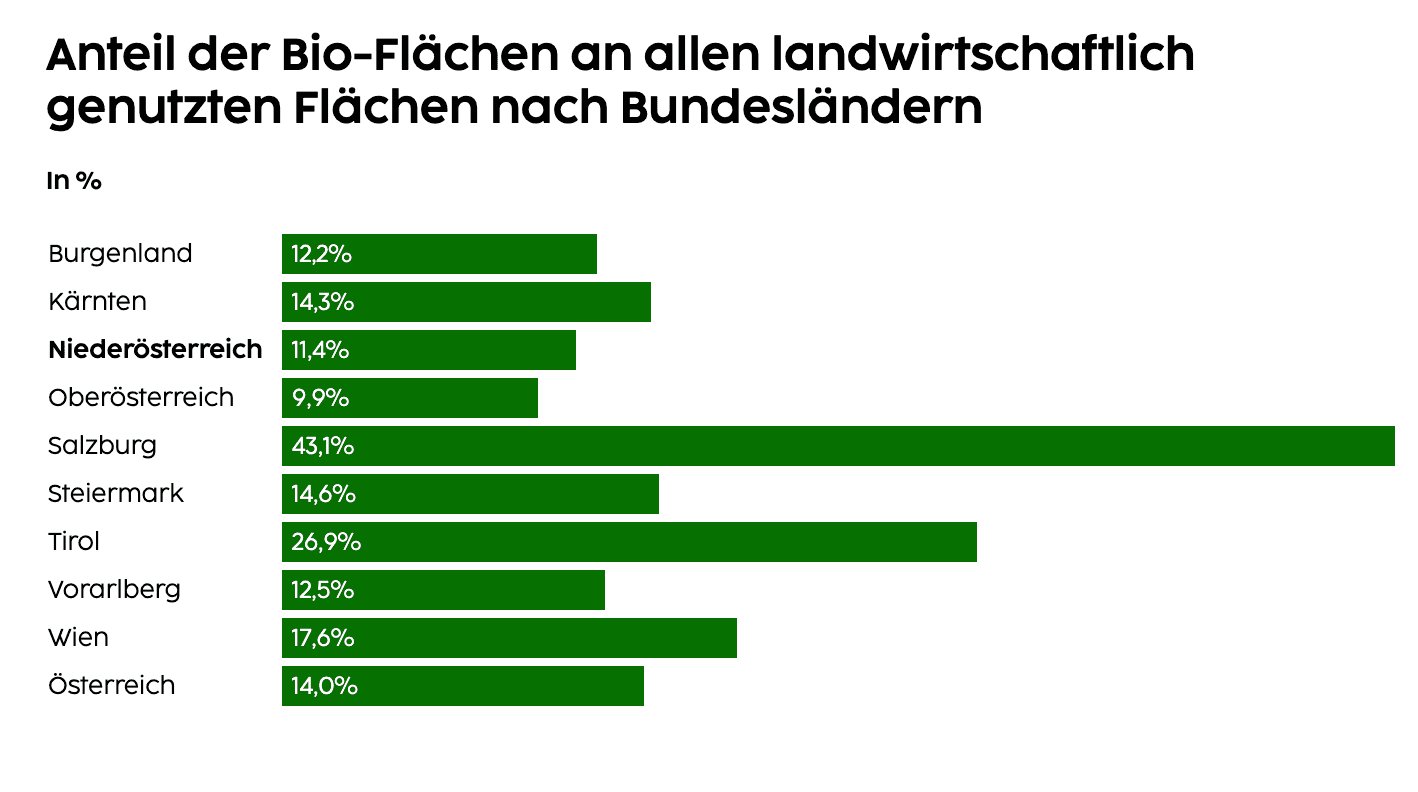 Niederösterreich weist im Bundesländervergleich einen relativ geringen Anteil an Bioflächen gemessen an den landwirtschaftlich genutzten Flächen aus.
