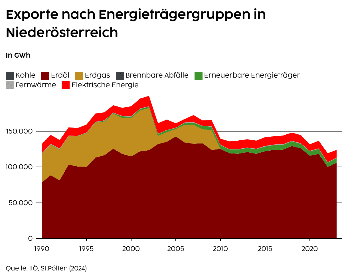 Nach Deckung des Energiebedarfs bzw. nach der Weiterverarbeitung exportieren Österreich und Niederösterreich Energieträger wie Kohle, Erdöl, Erdgas, Erneuerbare Energieträger und elektrische Energie.