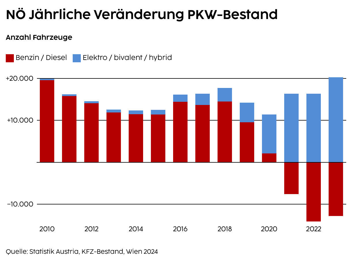In der Veränderung im PKW-Bestand in Niederösterreich zeigt sich der Rückgang bei den fossilen Antrieben von Benzin und Diesel sowie die Steigerung bei den alternativen Antrieben von Elektro, Hybrid- und Bivalentsystemen.